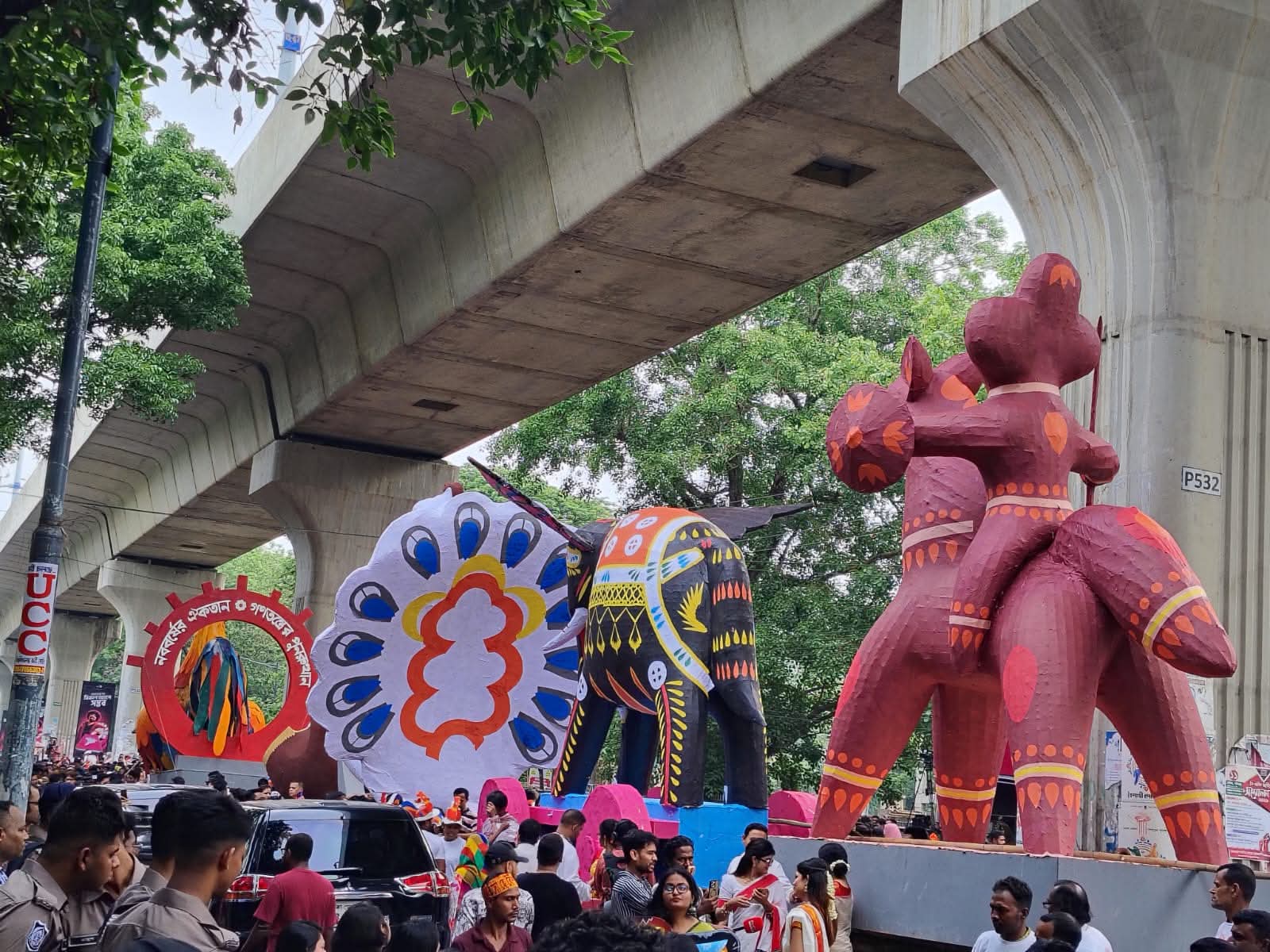 ঢাকা ও অন্যান্য শহরে বৈশাখ আসে আরও জাঁকজমক নিয়ে। সকালে রমনা বটমূলে গান, তারপর চারুকলার মঙ্গল শোভাযাত্রা যেখানে বিশাল মুখোশ, পাখি, বাঘ, সূর্য আর নানা প্রতীক মিলে তৈরি হয় এক বর্ণিল প্রতিবাদের ভাষা।